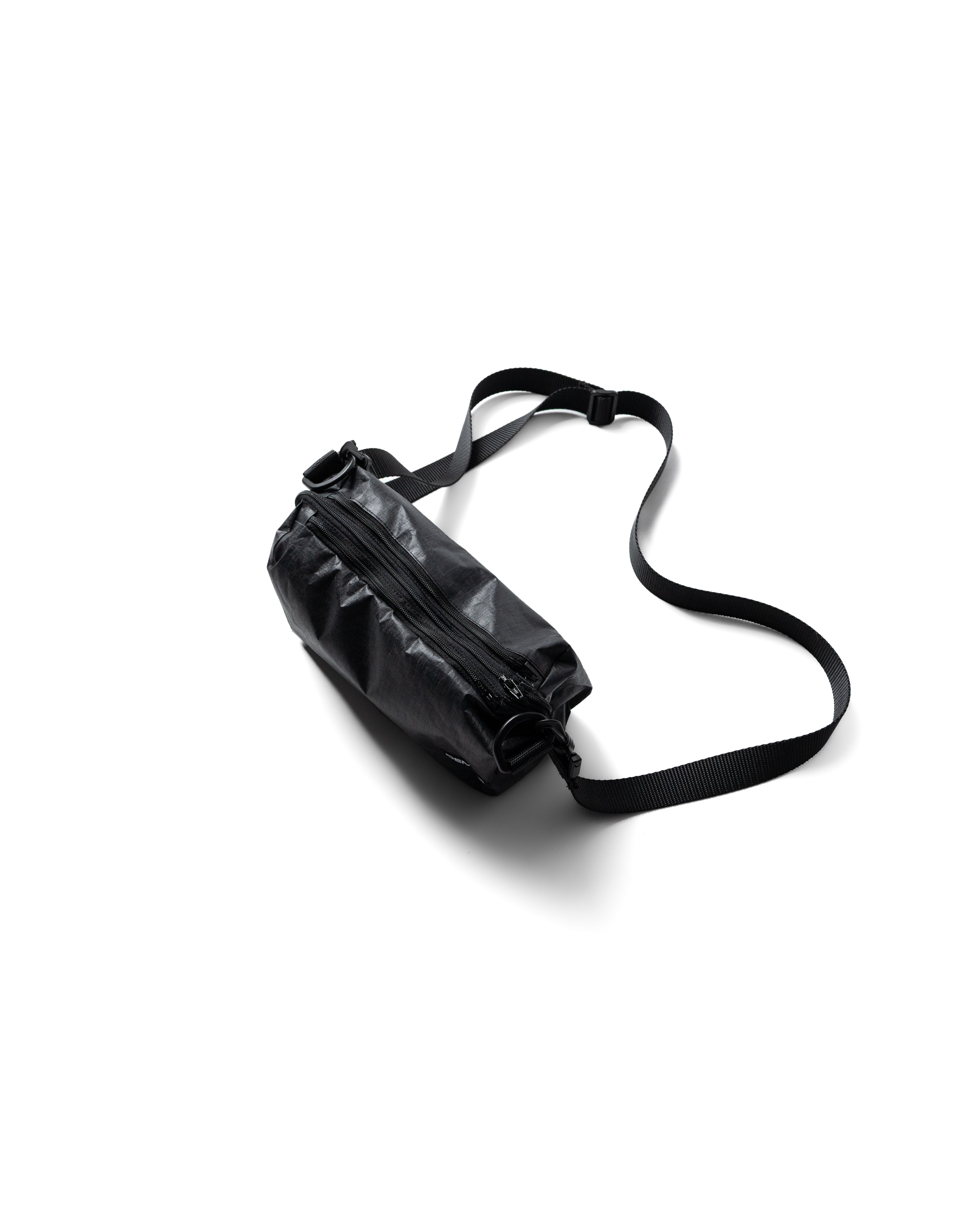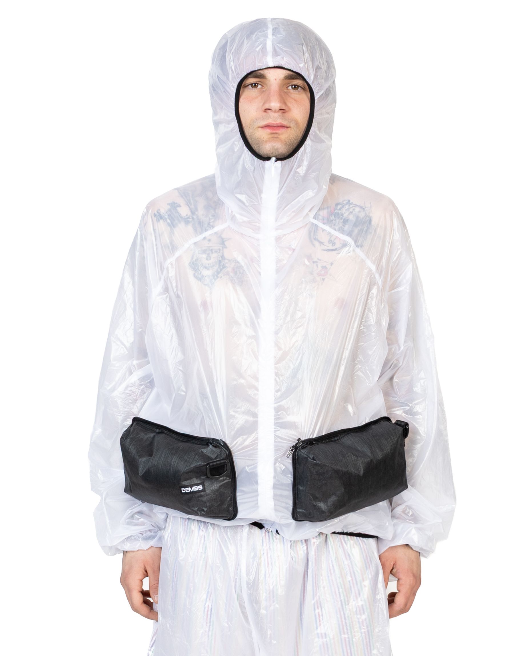 Ripstop backed waterproof dyneema bag featuring two separate storage compartments with a hidden packable waterproof jacket between. Jacket is made of super lightweight waterproof silnylon and is oversized to fit over any jacket or even a bicycle helmet, yet features elasticated hems, cuffs and hood opening to ensure a comfortable fit.